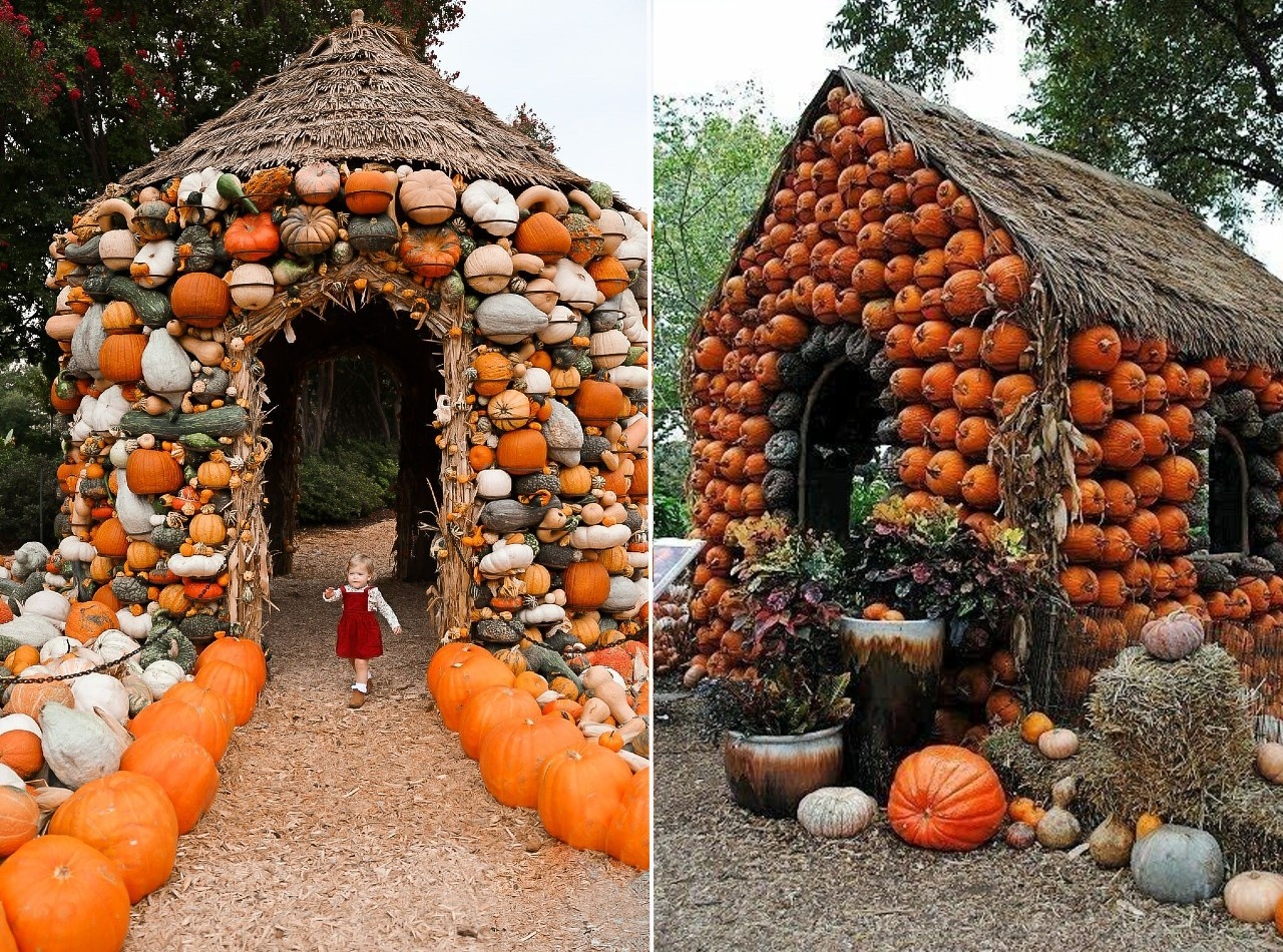 Некоторые инсталляции могут воспроизводить целый уголок деревни, а на их обустройство уходит до сотни тысяч тыкв разных форм и размеров.