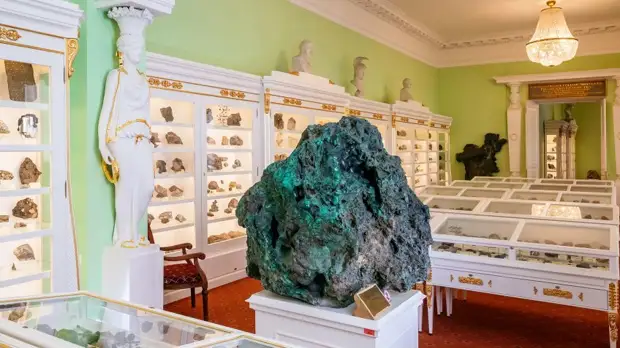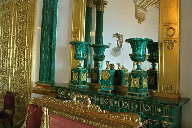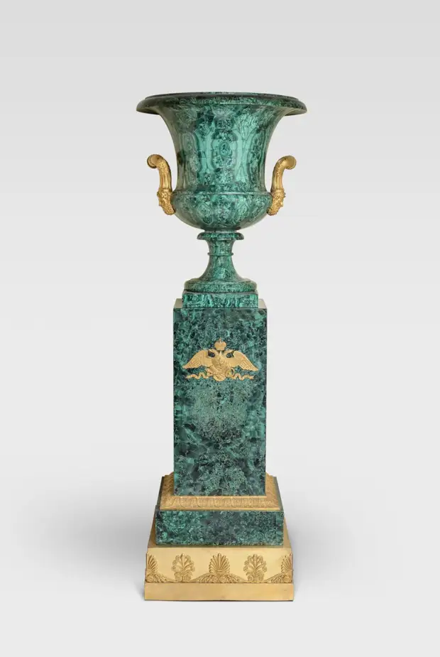 Большая малахитовая ваза-амфора по рисунку И.И. Гальберга, созданная на Екатеринбургской гранильной фабрике в 1823-1830 годах, находится под золоченой сенью в Малахитовом зале Эрмитажа.