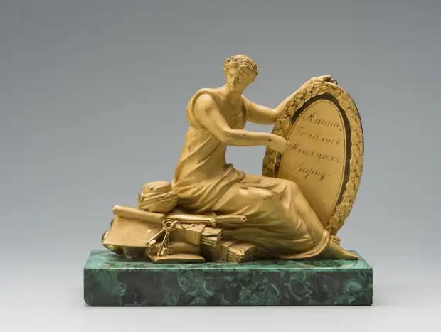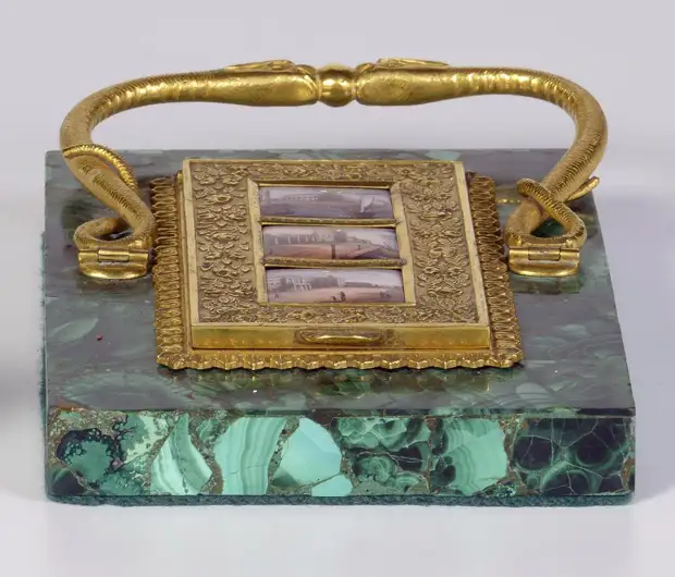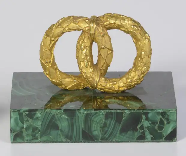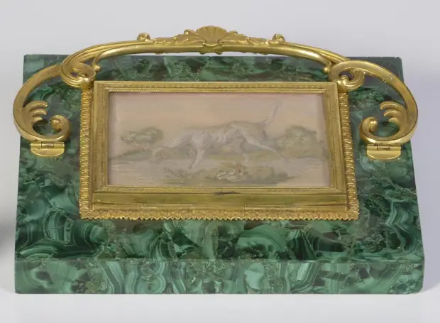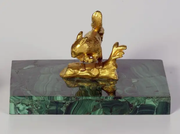 Малахитовые пресс-папье. Представляют собой отшлифованный брусок малахита со скульптурой из позолоченной бронзы сверху. Также встречаются пресс-папье с рисунком в рамке и витиеватой ручкой.