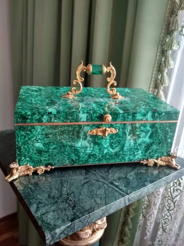 Сделать это было вовсе несложно – малахит не очень твердый минерал и легко поддается обработке. Именно русские мастера и придумали прием, который позже во всем мире назовут "русской мозаикой". Они распиливали камни перпендикулярно узору на тоненькие пластины, а потом составляли из них мозаику, удачно состыковывая и как бы продолжая узор, который располагался внутри камня. Благодаря такому приему можно было из сравнительно небольшого куска сделать первоклассную облицовку любой поверхности, и не только горизонтальной. Так постепенно появились малахитовые столики, шкатулки, вазоны, чаши, колонны.