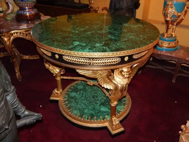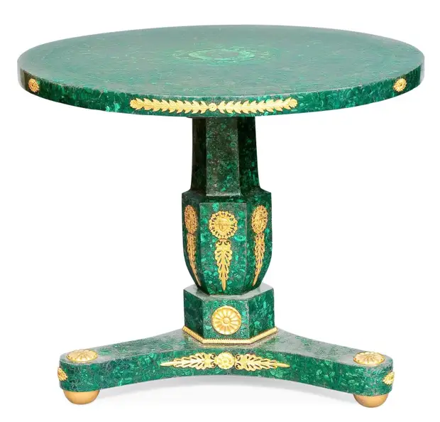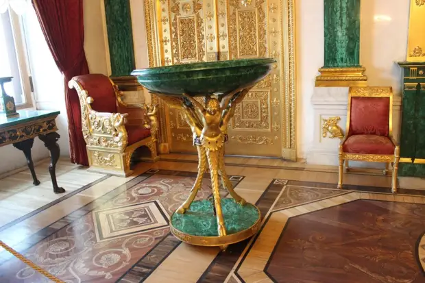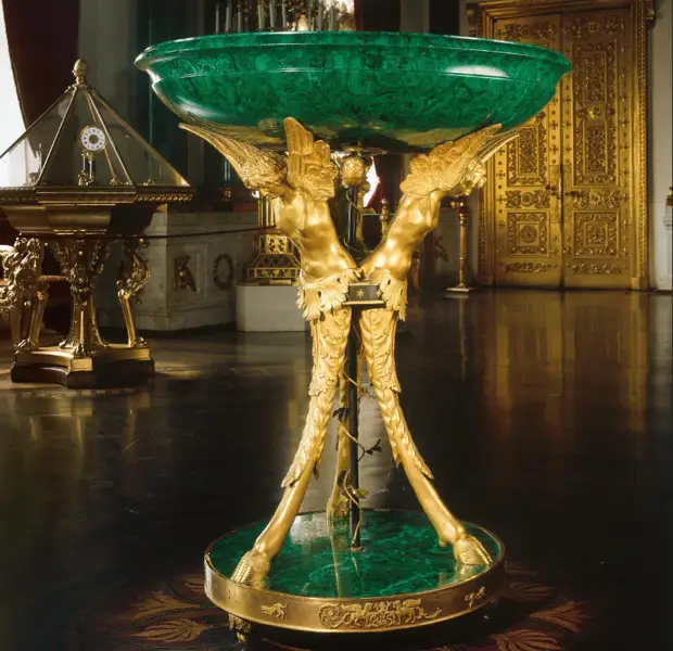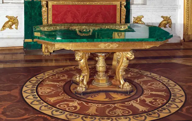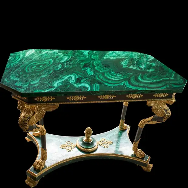 Стол с малахитовой столешницей, выполненный по проекту И.И. Гальберга. Находится в Малахитовом зале Эрмитажа.