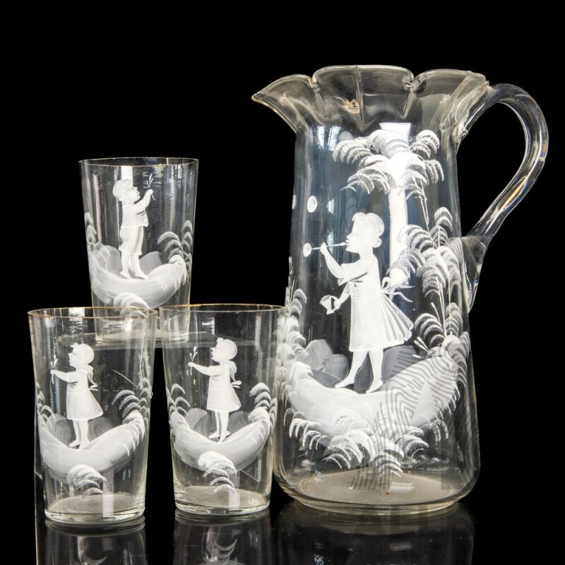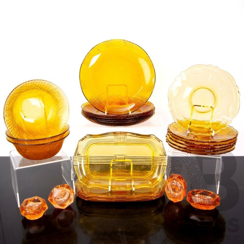 Коллекция функциональной посуды из янтарного стекла, прессованного и гранёного с подставками.