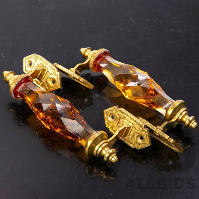 Латунные дверные ручки (винтаж) с гранёным янтарным стеклом.