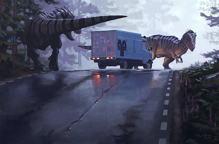 Все его работы нарисованы электронным пером на том же планшете Wacom, который художник использует для коммерческих заказов для кино, рекламы и видеоигр. Не важно, что рисует Столенхаг, будь то аллозавр, наступающий на грузовик прямо посреди дороги, или компания ребятишек, любующихся закатом на скале, за которой виднеются очертания огромных, блекло светящихся заводских строений, в любом случае, цифровое изображение будет выглядеть почти как старая-добрая картина маслом по холсту. «Я начинал с акварелей и гуаши, поэтому я стараюсь как можно лучше имитировать традиционный ход работы, прикладывая много усилий для того, чтобы мазки электронной кисти выглядели естественно, и сохраняли рукотворное качество», - рассказывает Столенхаг.
