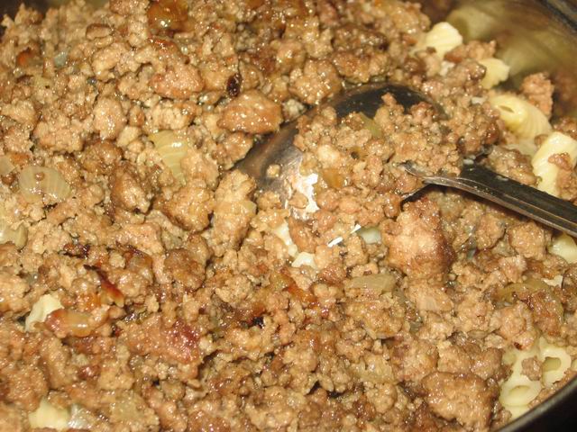 Готовые макароны пересыпаем обратно в кастрюлю, ввыкладываем готовый фарш из сковороды.