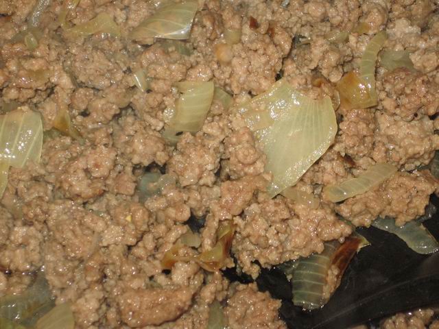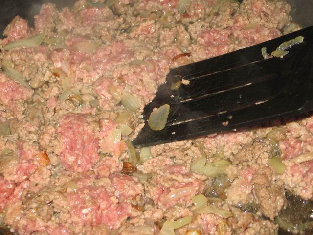 Обжариваем его с мелко нарезанным луком в достаточном количестве растительного масла. Фарш не должен схватиться комками, он должен быть рассыпчатым, а для этого придётся часто помешивать его на сковороде.