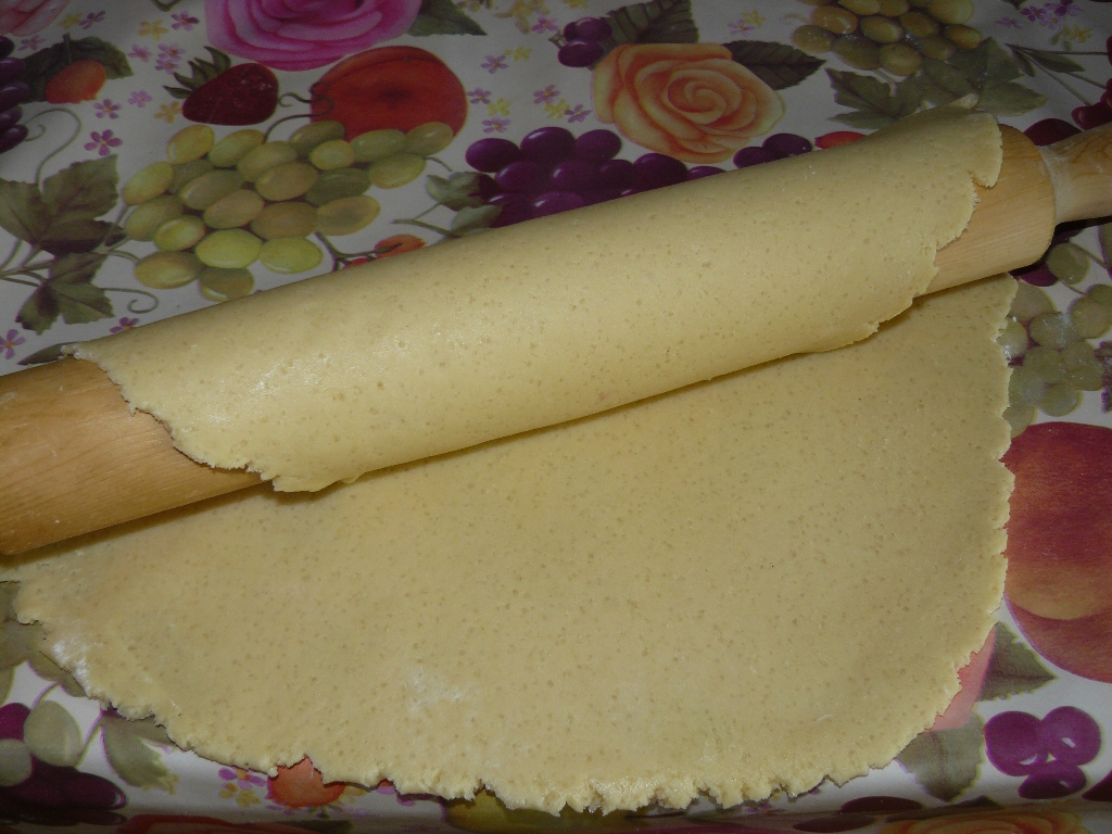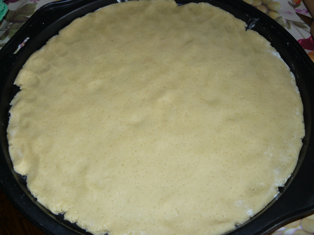 Тесто довольно эластичное и раскатываем мы довольно тонко. Чтобы перенести раскатанный пласт в форму, надо еще потрудиться. Но я делаю этотак: слегка присываю мукой, чтобы не слипалось, быстро, но аккуратно накручиваю на скалку и также быстро раскатываю в форму.
