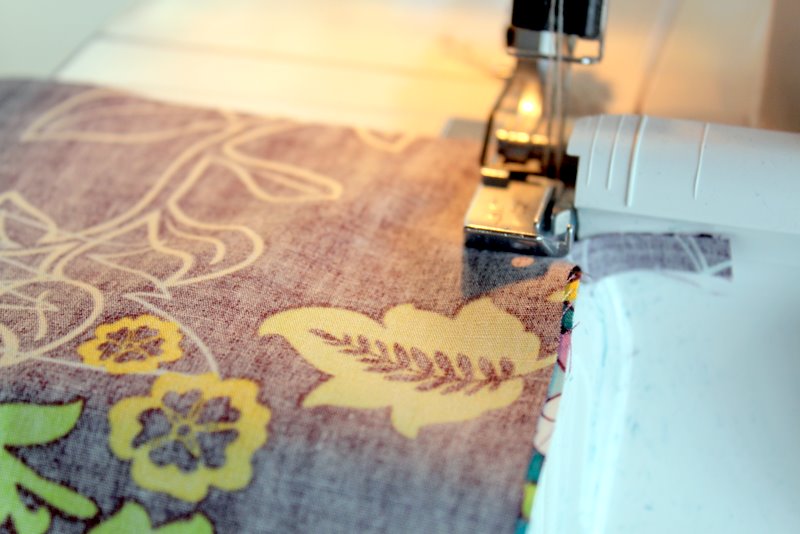 Сшиваем задние части полотнища, оставив 8 см сверху не зашитыми. Все швы обрабатываем швом зиг-заг и разутюживаем.