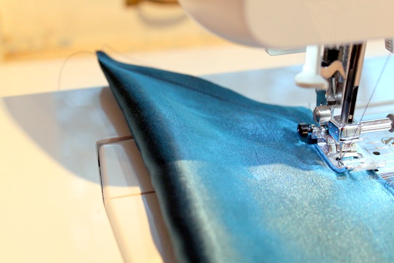 Переходим к поясу. Сложите части, которые вы выкроили ранее пополам лицевыми сторонами друг к другу и срежьте оба конца по диагонали. Прострочите по краю, оставив 8-10 см для выворачивания. Выверните пояс на лицевую сторону. Проутюжьте. Вручную зашейте отверстие, которое использовали для выворачивания.