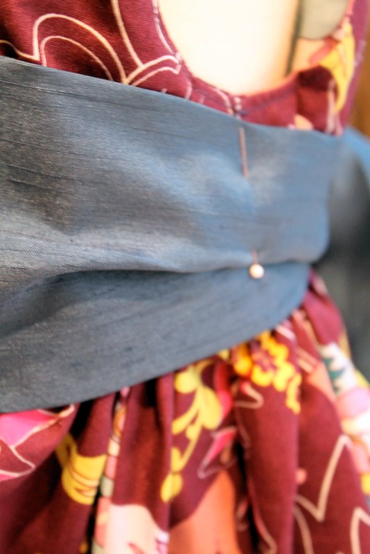 Приколите пояс по бокам платья. Сделайте одну складку сбоку. Пояс должен начинаться прямо под проймой. Пришейте пояс по бокам.