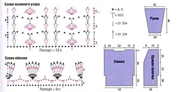 Рукава. Для каждого рукава набрать по начальной цепочке из 54 возд. п. + 3 возд. п. подъёма и провязать 1-й ряд следующим образом: 1 ст. с/н в 6-ю возд. п. цепочки от крючка, 1 возд. п., 1 ст. с/н в эту же возд. п., * 4 ст. с/н в 5-ю возд. п. основания цепочки от крючка, 1 возд. п., 4 ст. с/н в эту же возд. п., 2 ст. с/н в 5-ю возд. п. основания цепочки, между ст. с/н 1 возд. п., 2 ст. с/н в 3-ю возд. п. основания цепочки, между ст. с/н 1 возд. п. * повторять от * до * 2 раза, всего 3 раппорта, 2 ст. с/н в 5-ю возд. п. основания цепочки, между ст. с/н 1 возд. п., 1 ст. с/н во 2-ю возд. п. основания цепочки. Затем вязать 42 р. согласно схеме основного узора. Для расширения рукава необходимо выполнить прибавки с обеих сторон в 3-м ряду, далее в каждом 2-м ряду по 1 п. В 42 ряду от начальной цепочки работу закончить.