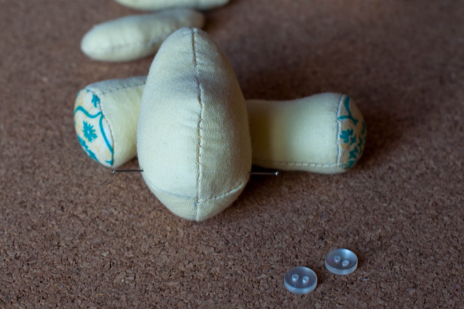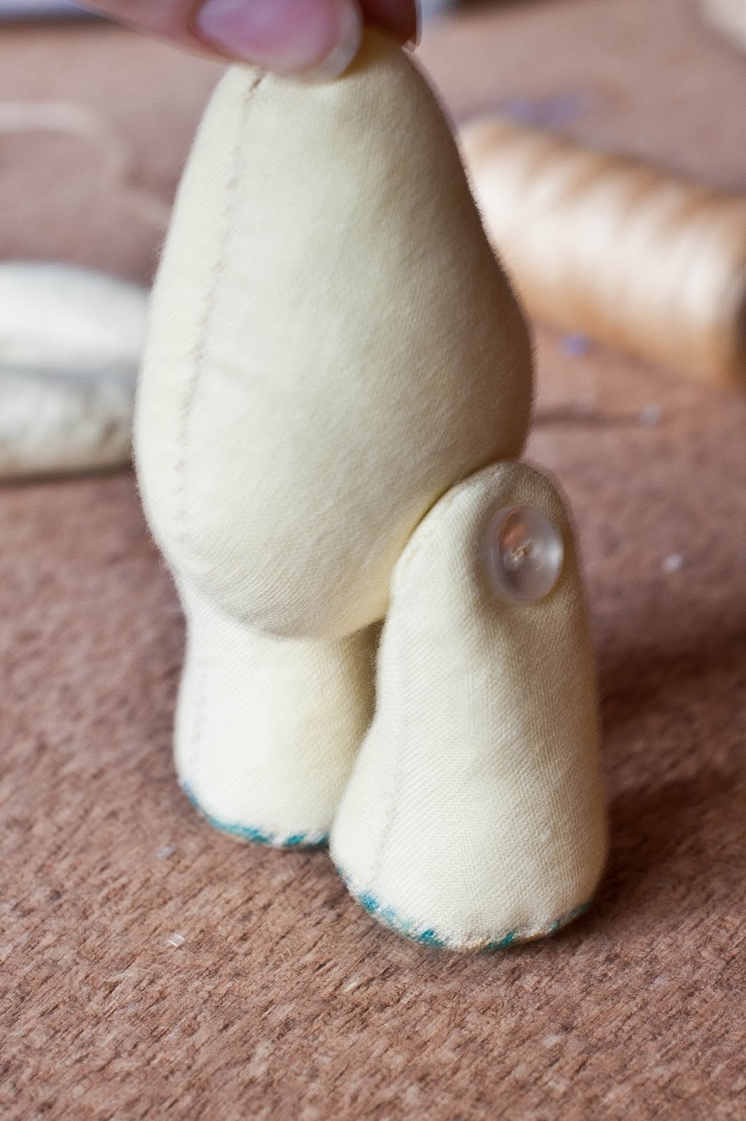 Ножки и ручки у нас будут на нитяном креплении, так как, как уже писала выше авторскую задумку с шплинтами, я пока не освоила)) Ножки я крепила пуговками, ручки, как более изящную часть тела, продолговатыми деревянными бусинами.