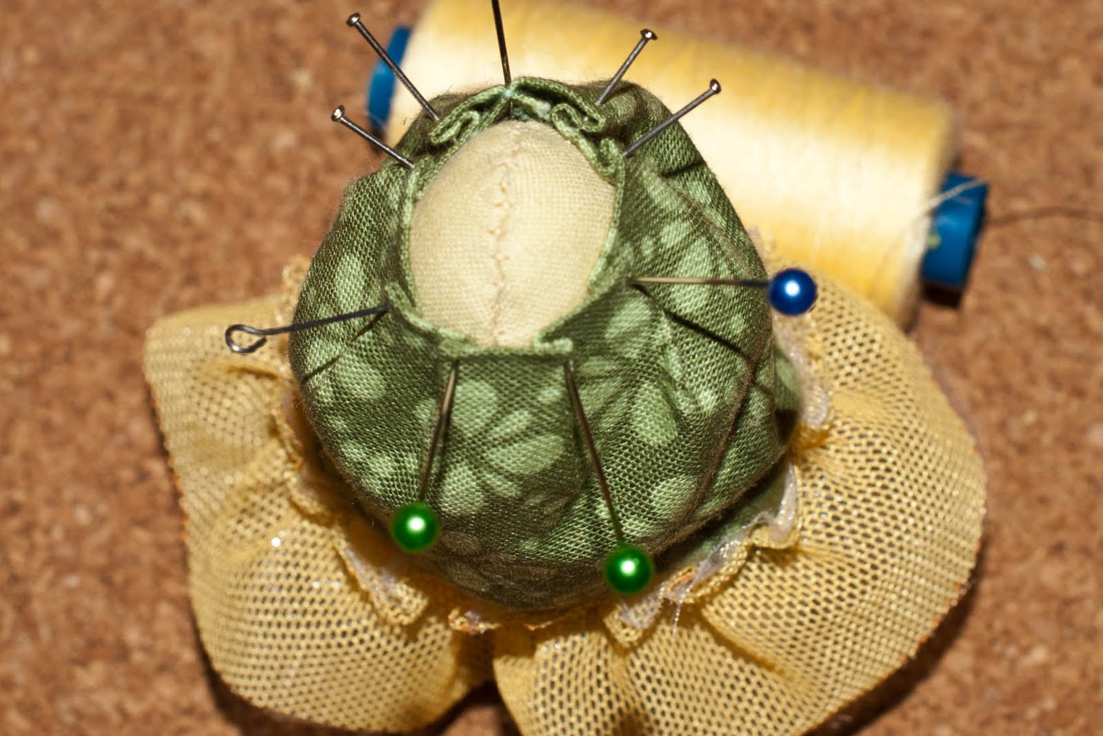 Теперь одеваем на нашу красоту платьице и будем пришивать голову. Сначала прикалываем ее булавками, что бы было легче шить.