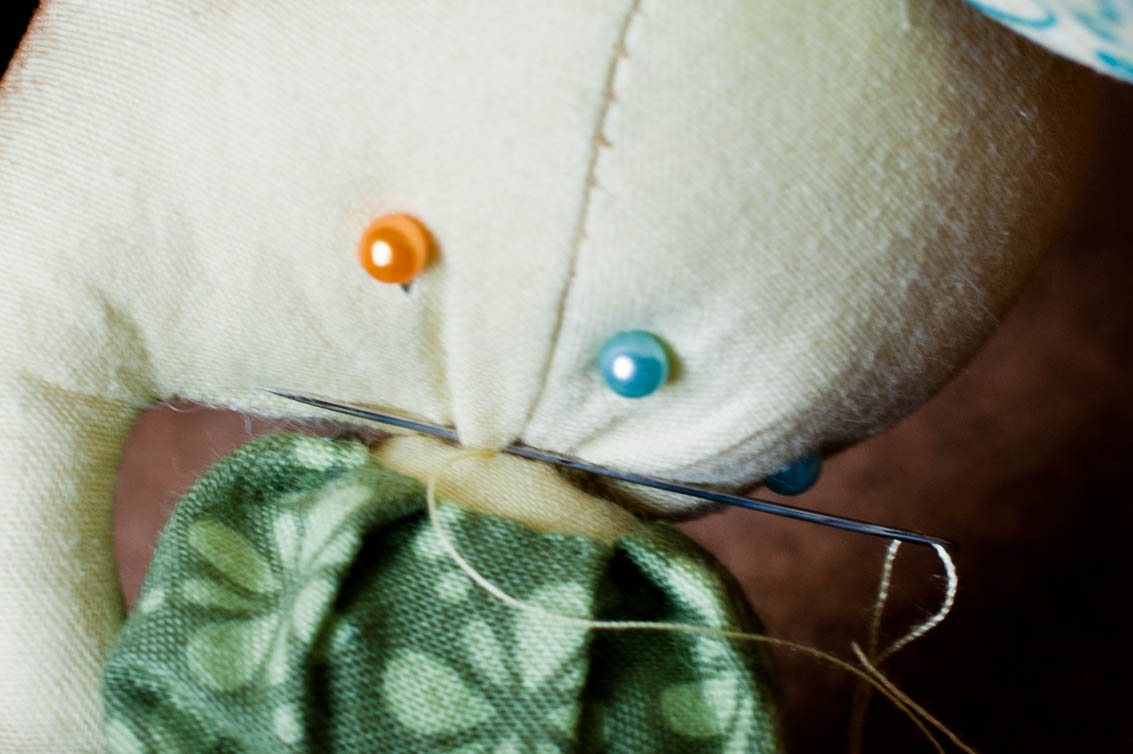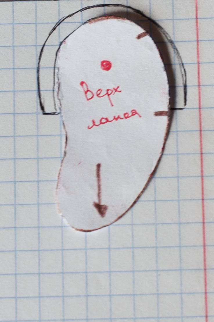 Приступим к голове. А точней к нашим ушкам. Ушки я предварительно зашила потайным швом и булавками крепим на голове, в том положении как вам нравится. Пришиваем потайным швом.
