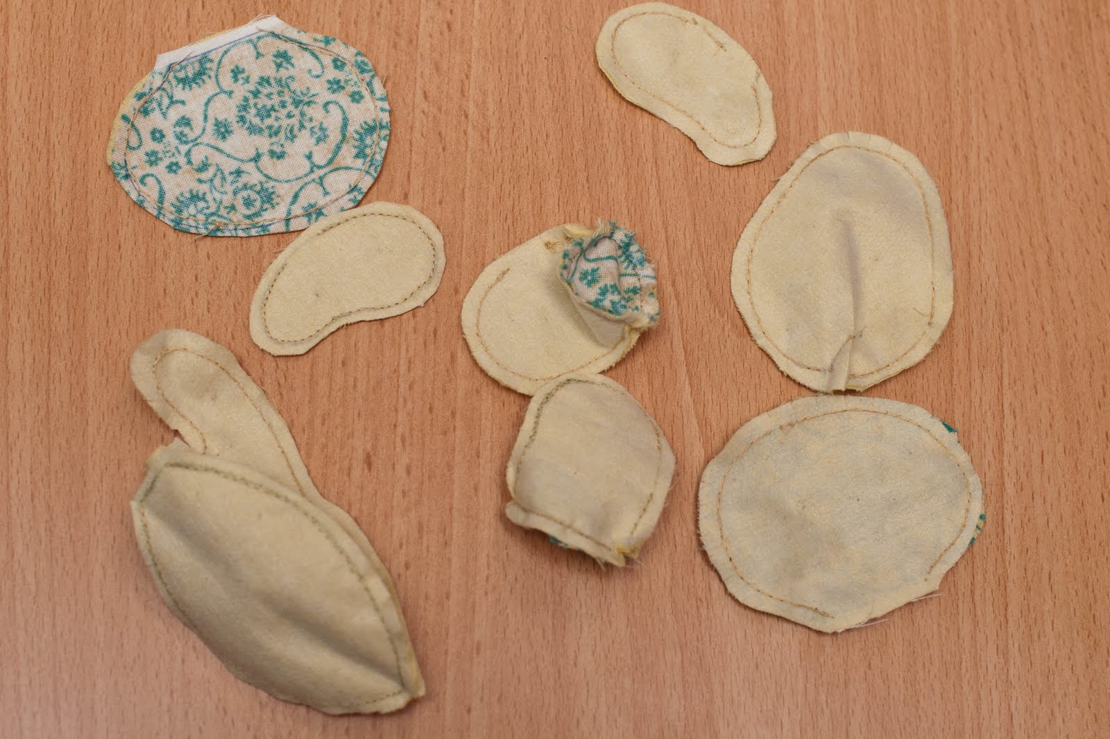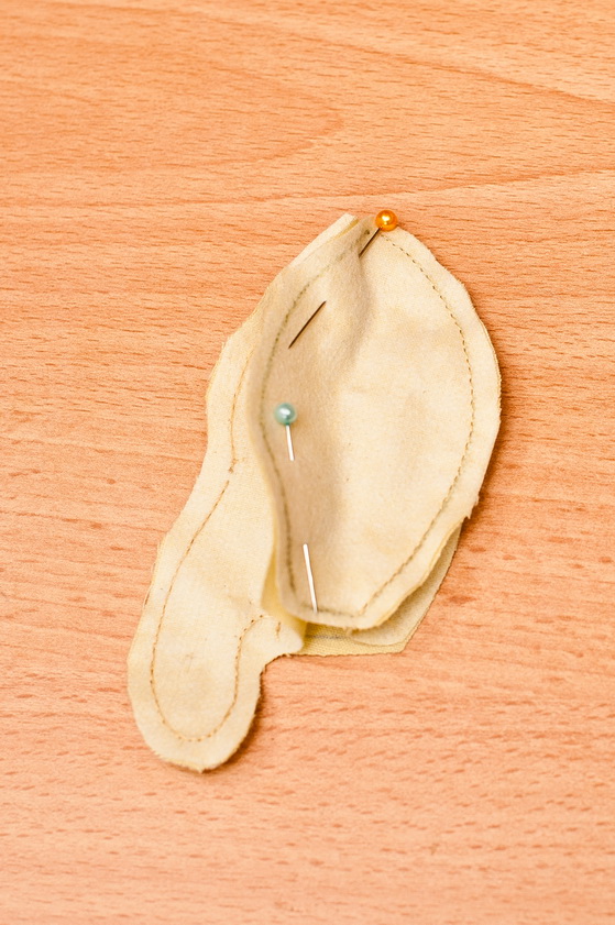 Вот что мы получаем в итоге. Не объемные детальки нужно прогладить, особенно швы, так они будут аккуратней потом выглядеть. Все припуски надсекаем в округлых местах перпендикулярно шву , что бы они потом не топорчились, после выворачивания.
