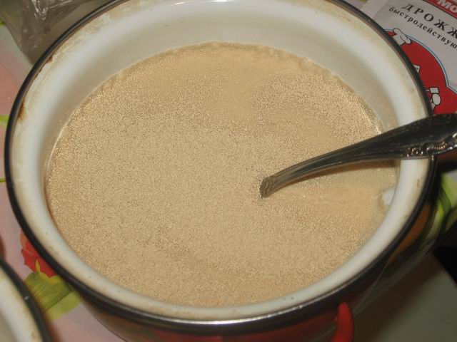 Сначала разводим дрожжи в тёплом молоке с сахаром для теста. Минут 20 надо подождать.