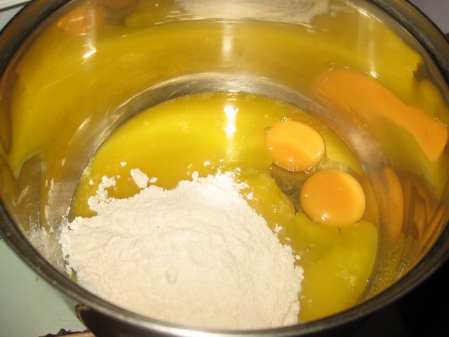 Соединяем растопленное масло, яйца и начинаем замешивать тесто.