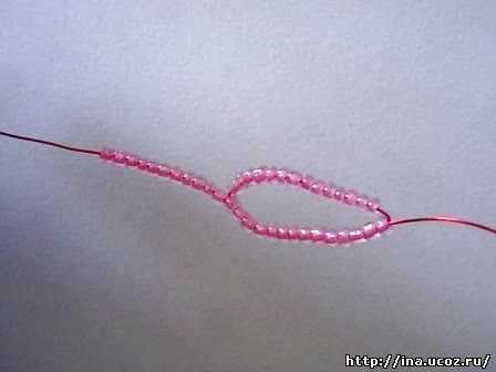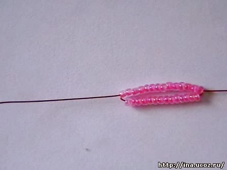На свободный конец проволоки набираем около 11 бисеринок, в зависимости от размера бисера. Эти бисеринки должны заполнить получившееся ранее кольцо
