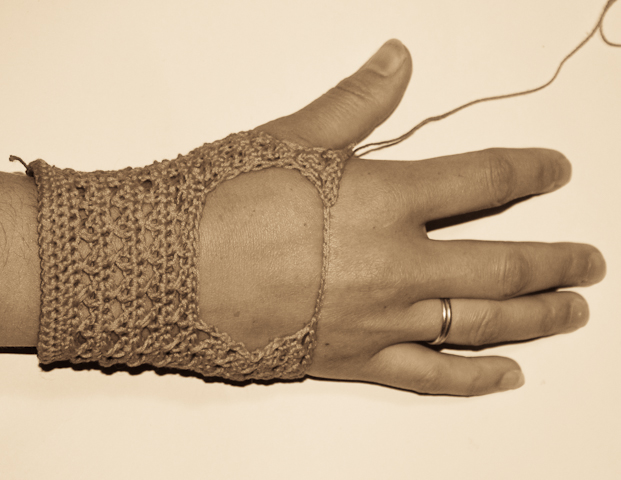 Не дойдя ст. б.н. до 2-х перекрестов, вяжу цепочку из 6-ти в.п. для основания мизинца и по рисунку вяжем 2 ряда. В последнем ряду для заужения не провязываю в.п. в перекресте.