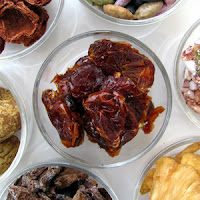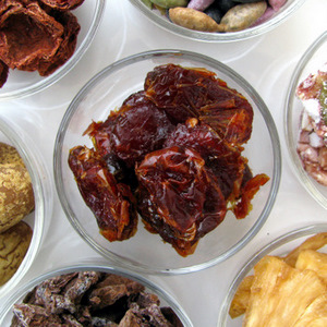 Необычная закуска к чаю, имитирующая вяленое мясо, сочетающаяся как с легкими, так и с насыщенными чаями. Грибы Шиитаке —это один из самых знаменитых компонентов дальневосточной кулинарии. Их используют очень широко и готовят самыми разными способами. Достаточно часто эти грибы используются для приготовления «обманок», например — для имитации вяленого мяса. Оригинальный вкус и низкая калорийность делают вяленые Шиитаке очень популярной закуской к чаю.