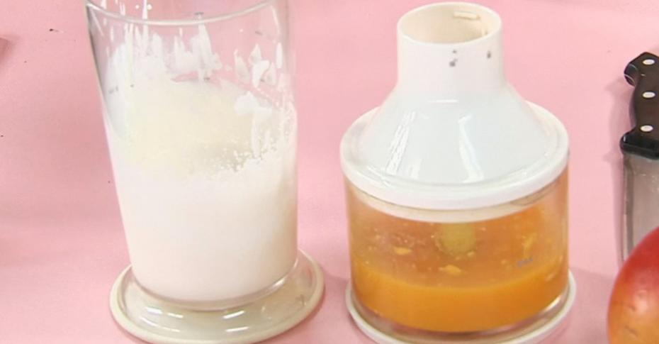 Выкладываем манго в блендер. Измельчаем в пюре. Добавляем кардамон и мед. Перемешиваем. Взбиваем сливки