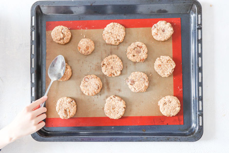 Теперь руками скатайте шарики и прижмите ложкой, чтобы получились более плоские печенья. Не стоит на одном противне размещать заготовки вплотную друг к другу. Во время выпечки тесто расплывется и заполнит пространство вокруг.