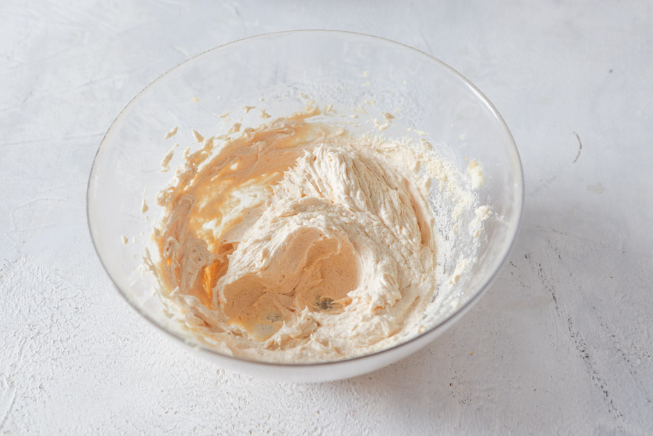 В другой миске соедините сливочное масло и сахар. Взбивайте миксером, мягкое масло легко соединится с сахаром и превратится в кремообразную массу.