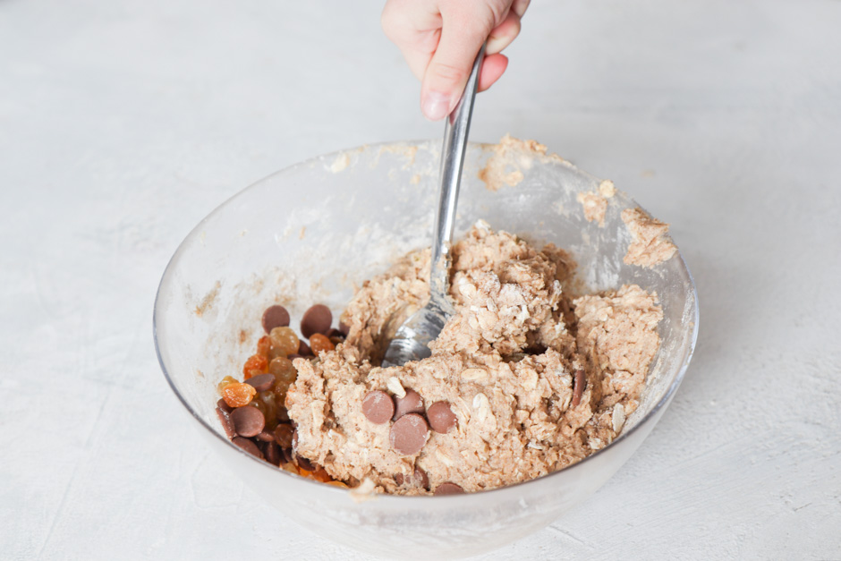 Последний этап - замешайте добавки в тесто. Тесто для печенья получается густым, мешать лопаткой не получается, только ложкой.