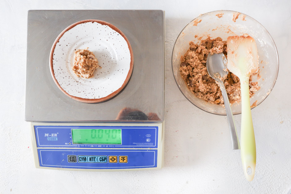Если Вы хотите, чтобы все печенья получились одинаковыми, тогда повторяйте за мной. Отмеряйте на весах кусочки теста одинаковой массы. Я отмеряла по 40 г, это примерно 1 столовая ложка.