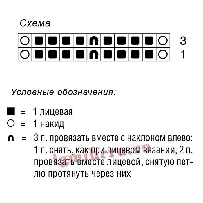 в 3 левых полосах лицевой глади = вязать лиц. гладью, не доходя 1 п. до середины полосы, следующую и среднюю петли провязать вместе лицевой, до конца полосы вязать лиц. гладью.