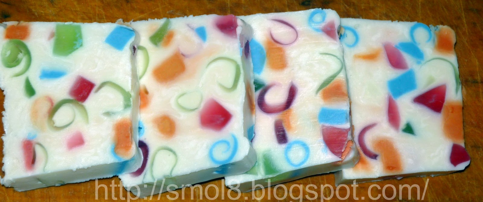 Я укладывала мыло и заливала слоями. Набросаю кусочки и завитушки, залью слой, снова набросаю и залью. Потом ставим в холодильник примерно на полчаса, час. Мыло проще достать из формы, обдав её горячей водой и перевернув. Дальше нарезаем на куски. И сушим, время от времени переворачивая, около 2 дней