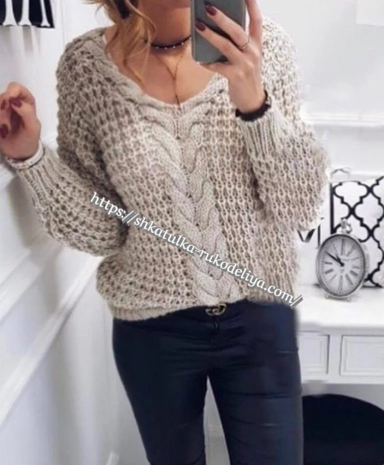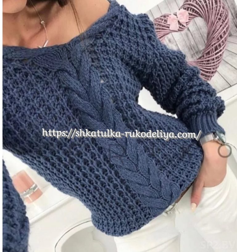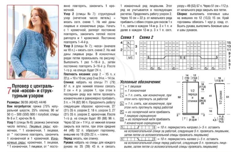 Пуловер с узором по центру спицами. Схема узора для женского пуловера