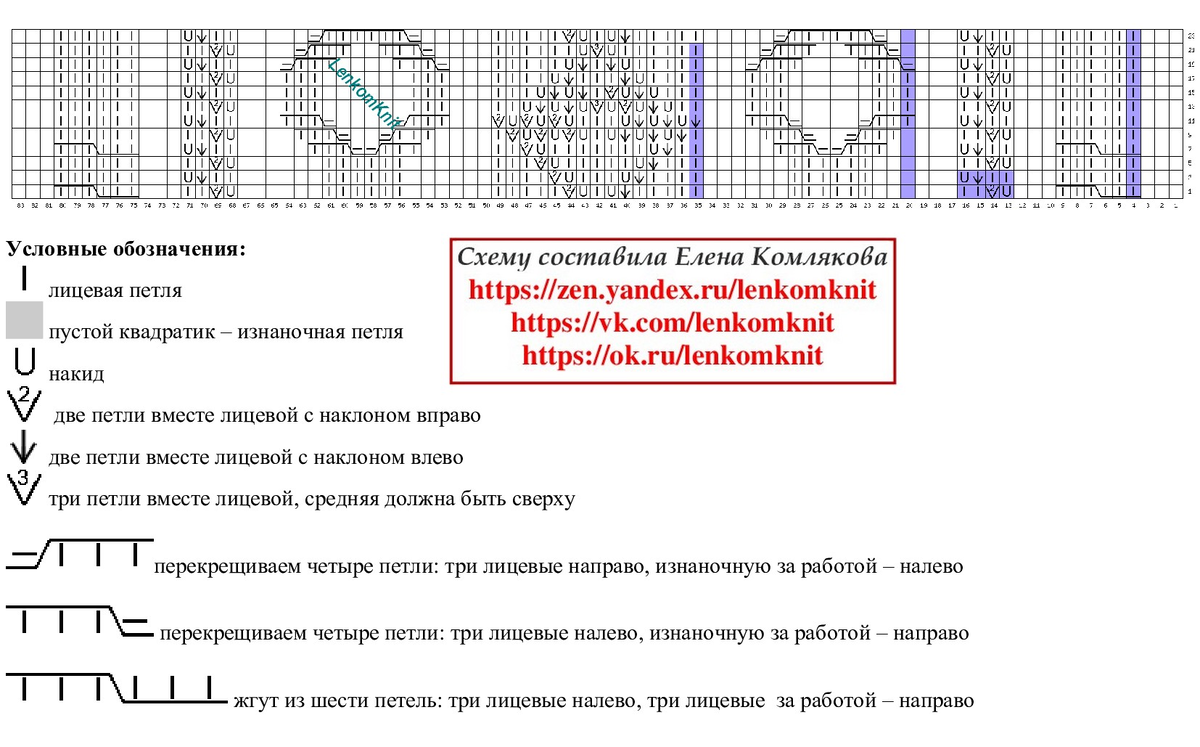 На этой схеме нарисованы все узоры для переда и спинки (для нечетных лицевых рядов, в четных изнаночных рядах все петли вяжем по рисунку). На схеме убралось 83 петли, это центральный узор для переда и спинки. Остальные петли справа и слева (для необходимой ширины деталей) вяжутся лицевой гладью. Раппорт каждого узора выделен фиолетовым цветом по его краю.