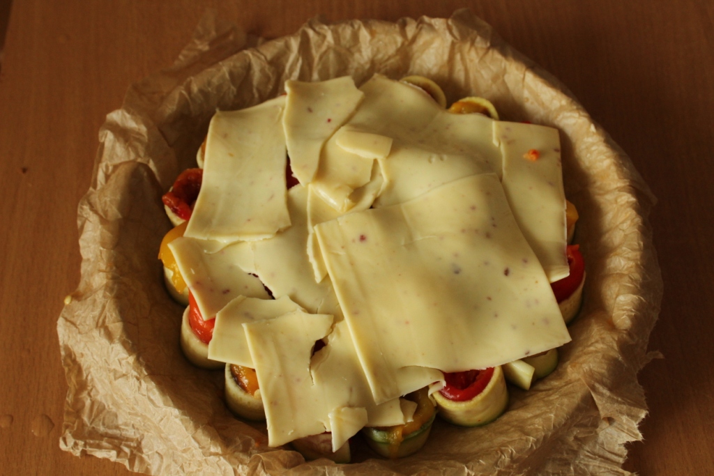 Выложить на разделочную доску ломтик кабачка, на него положить полоску перца и свернуть рулетом. Так поступить со всеми остальными ломтиками кабачка и перца. Форму для выпечки застелить пекарской бумагой и выложить рулетики. В оригинальном рецепте весь пирог состоит из рулетиков, но можно слегка разбавить их помидорами. Посолить, поперчить и сбрызнуть маслом.