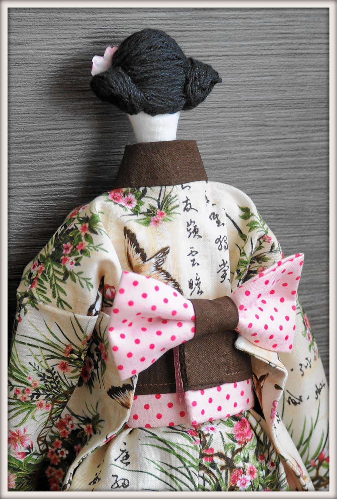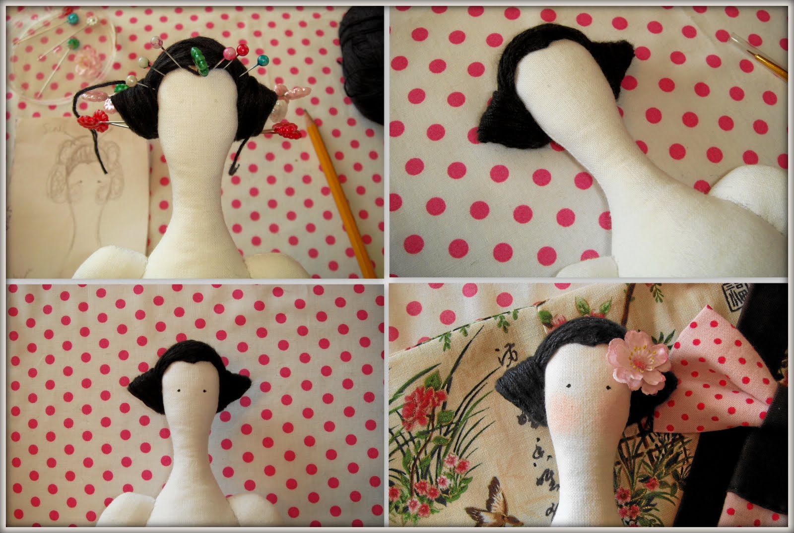 Сначала думала сделать прическу в стиле гейши, но потом передумала, кукла же в первую очередь Тильда, а во вторую-японка, пусть прическа будет в тильдосвском стиле ;)