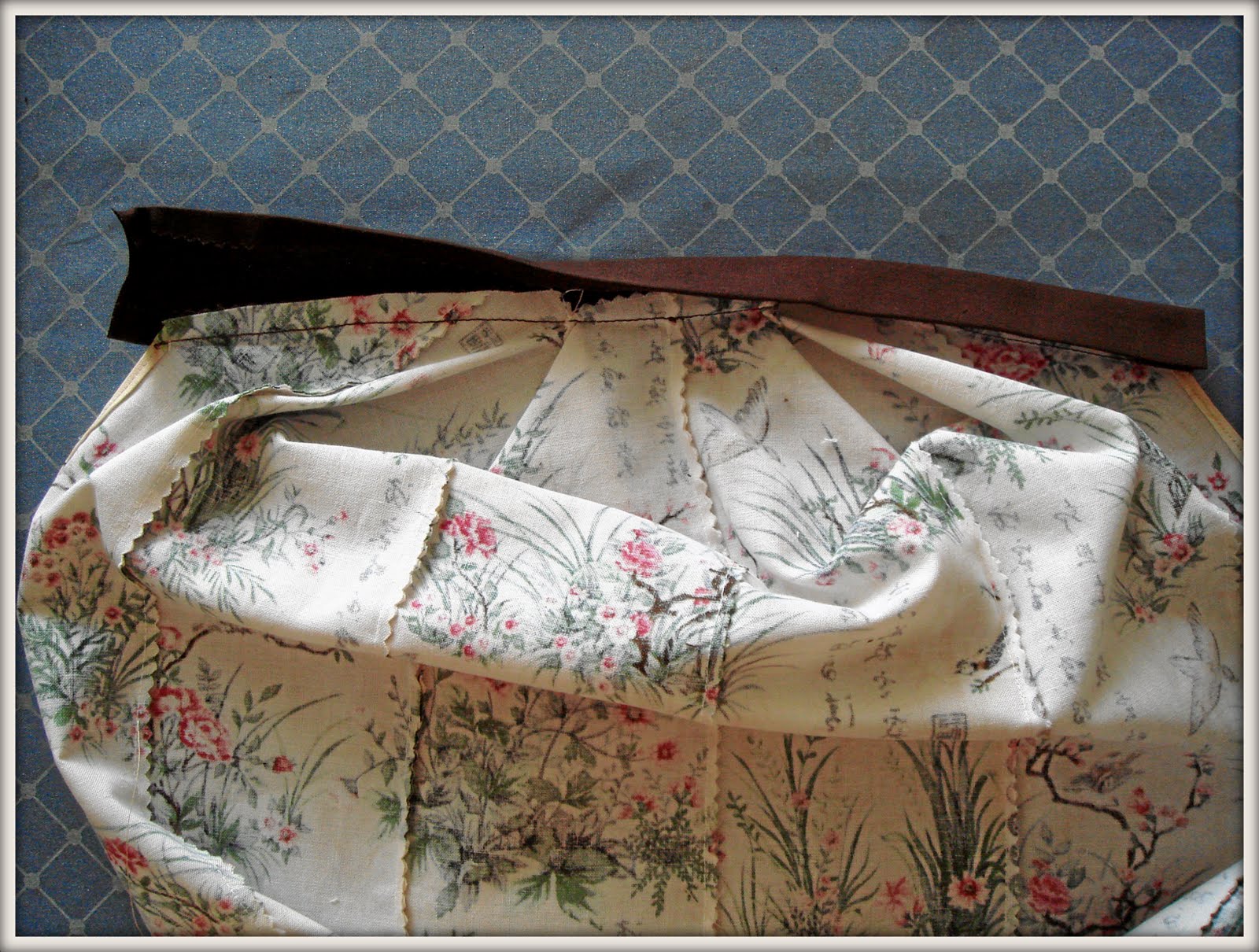 Ткань для пояса посадила на клеевую основу. Для отделки я пришила коричневую ткань (полоса длиной 2,5 см в готовом виде) чуть ниже середины пояса.