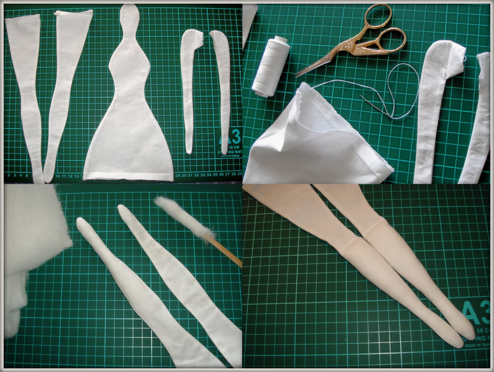 Дальше самое ответственное - набивка куклы! Тонкие детали набила - рулонным синтепоном, накручивала его на палочку и вставляла его в деталь, но более крупные части детали - продолжала набивать обычным синтепухом (не в шариках, а который как вата). Пробовала набивать синтепухом в шариках - для тильды он не подходит, дает целлюлитный эффект =) и при такой набивке тонкие детали начинают как бы закручиваться.