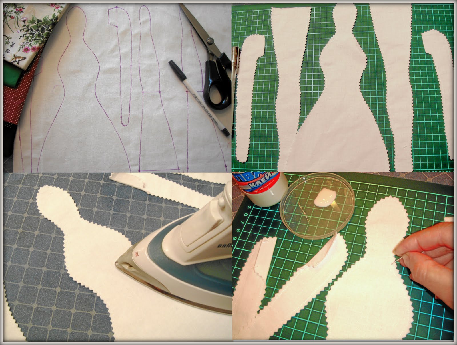 Итак,сложила ткань пополам и перенесла на ткань выкройку, затем прошила на машинке, проутюжила и вырезала детали, и опять проутюжила.