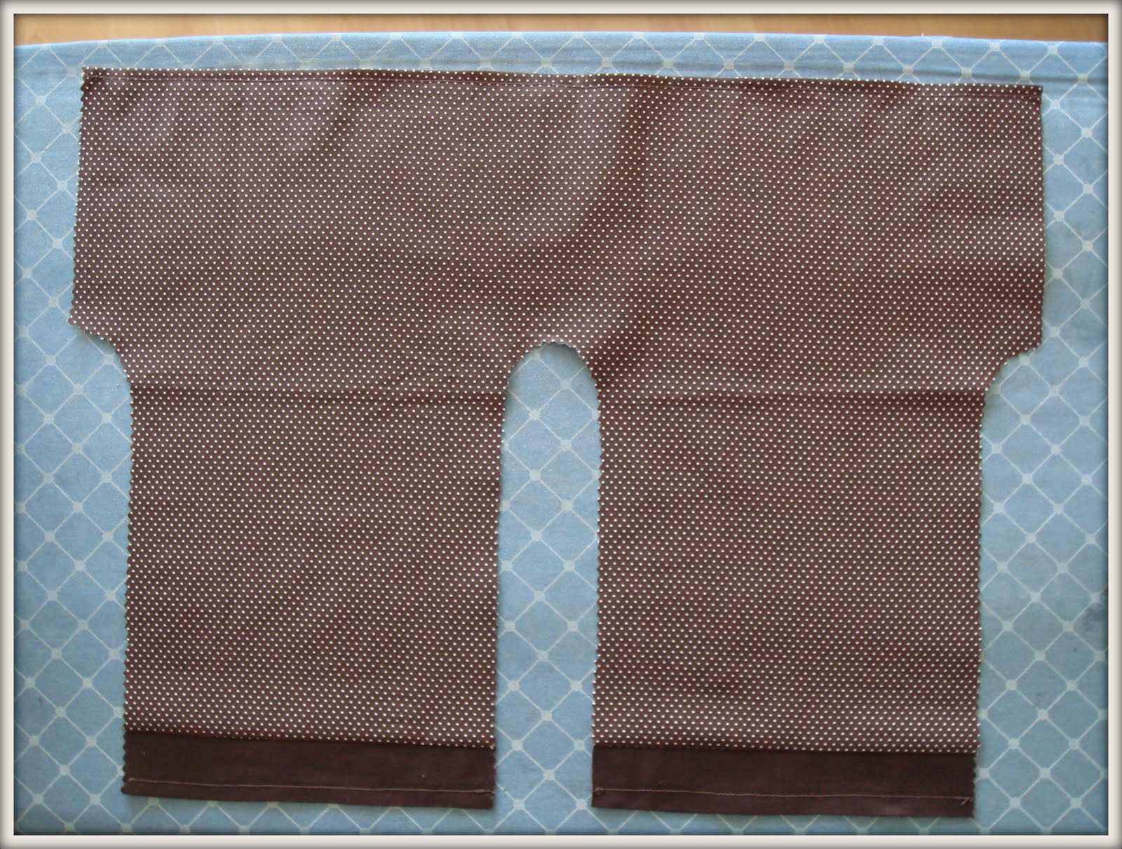 Обрабатываем верх штанов и низ гач. Верх подогнула и прошила. Уже в процессе решила добавить коричневые манжеты, полосы шириной примерно 4 см. (с припусками).