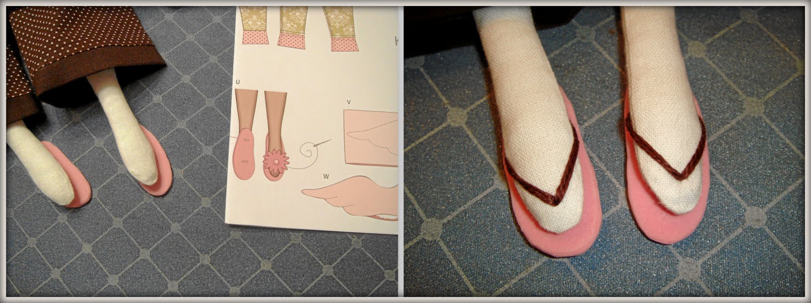 Тапочки вырезала из пенистой резины. Пришила к ножке, как показано на картинке, и сделала декор коричневыми нитками.