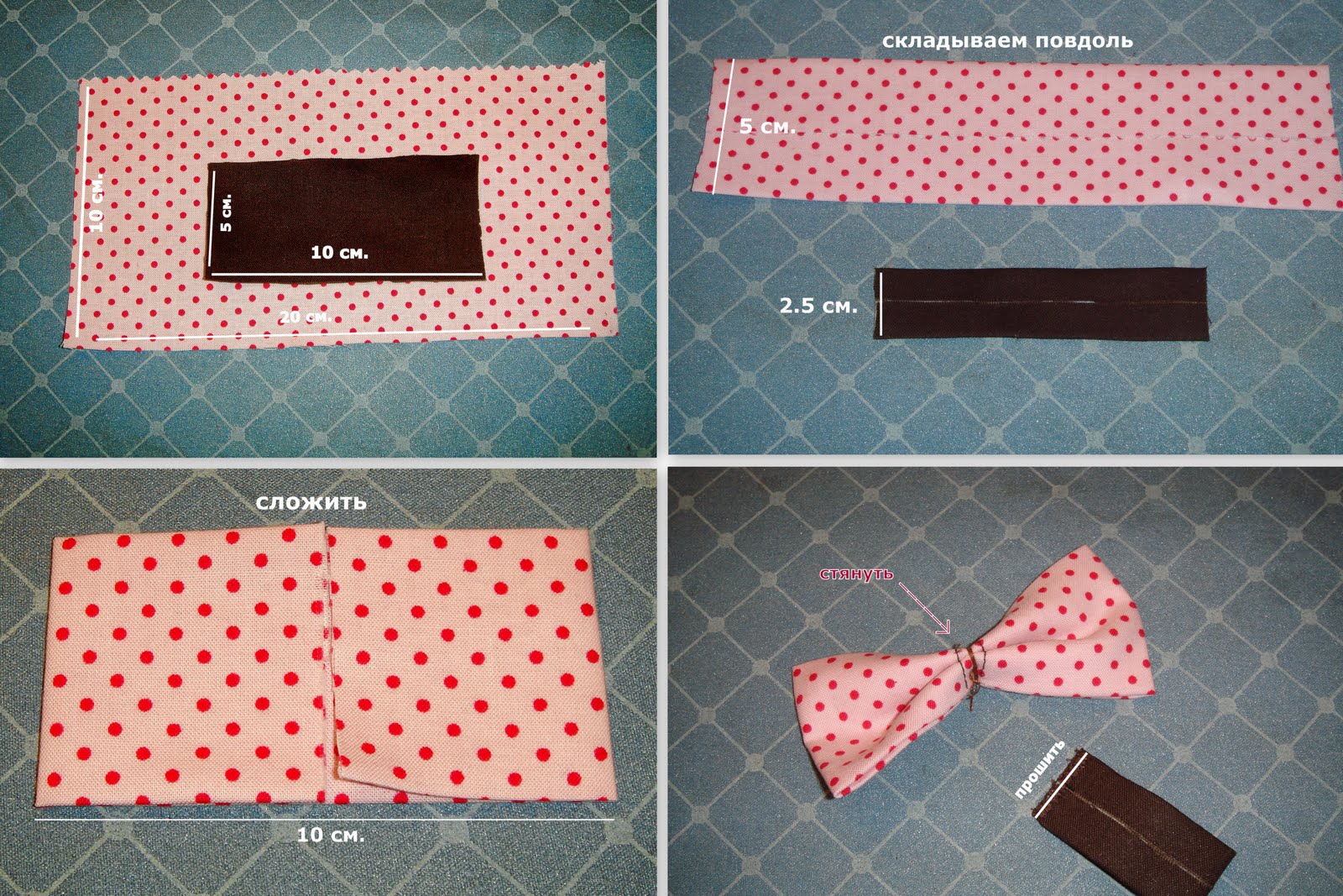Для бантика я выкроила 2 прямоуголька: 10 х 20 см - сам бантик, 5 х 10 см -перемычка бантика. Обе заготовки сложила повдоль, внутрь положила клеевую основу, проутюжила.