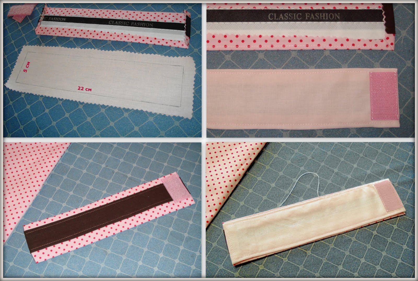 Определила место, куда пришью липучки. Колючки на изнанке, т.е на светло-розовой ткани, а мягкая часть липучки - на лицевой стороне пояса. Пришила липучки к деталям пояса и только потом эти две части пояса сшила между собой потайным швом.