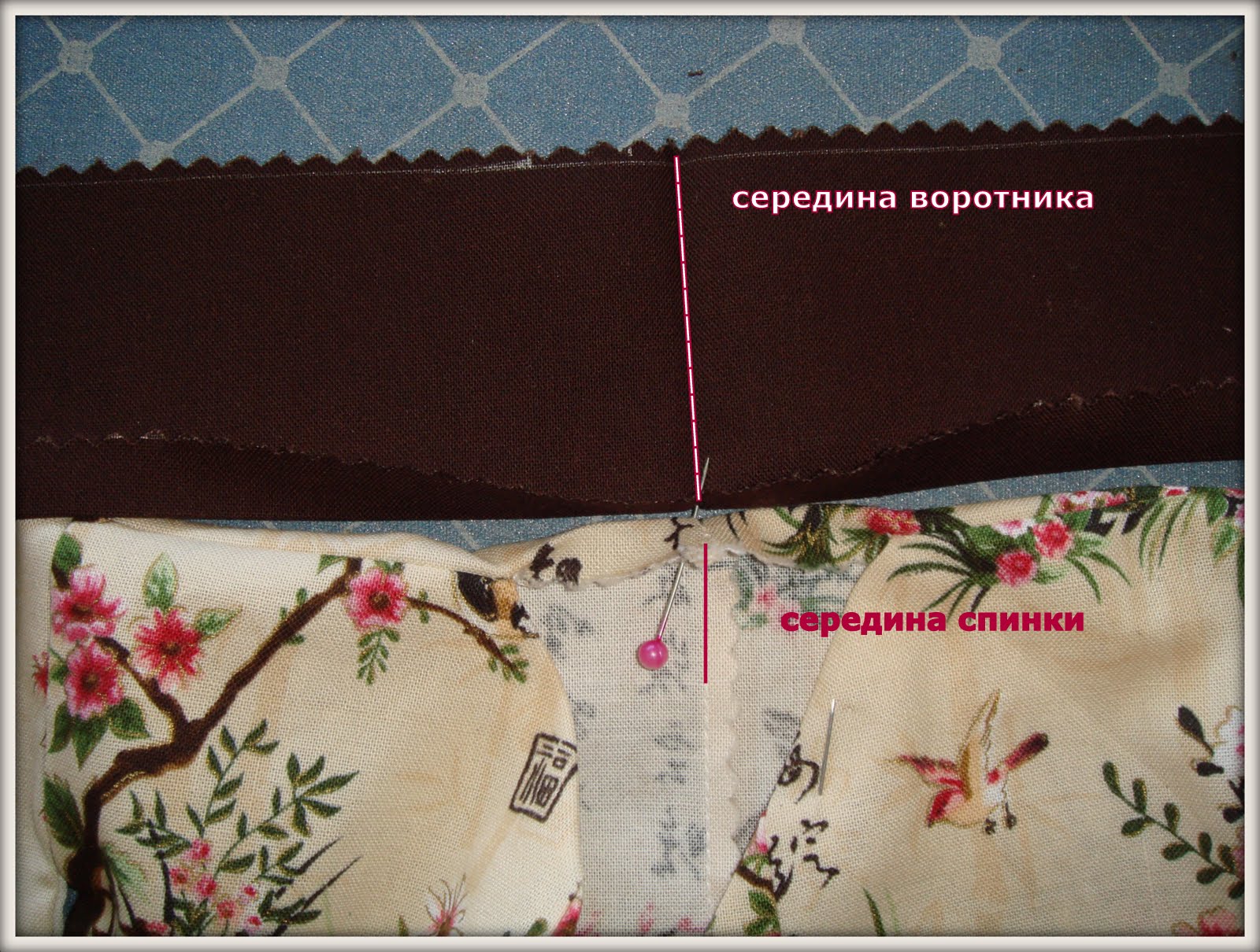 Сложила деталь воротника пополам (по ширине), определила середину и приложила к спинке, совмещая серединные точки.