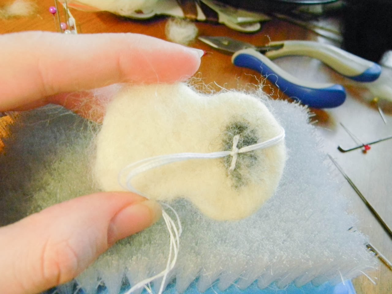 Сзади у меня выглядит все вот так непоэточно. Поэтом это безобразие я аккуратно заваляла белой шерстью. Можно сделать так же, либо пришить к какой-либо основе. Например, фетру или коже.