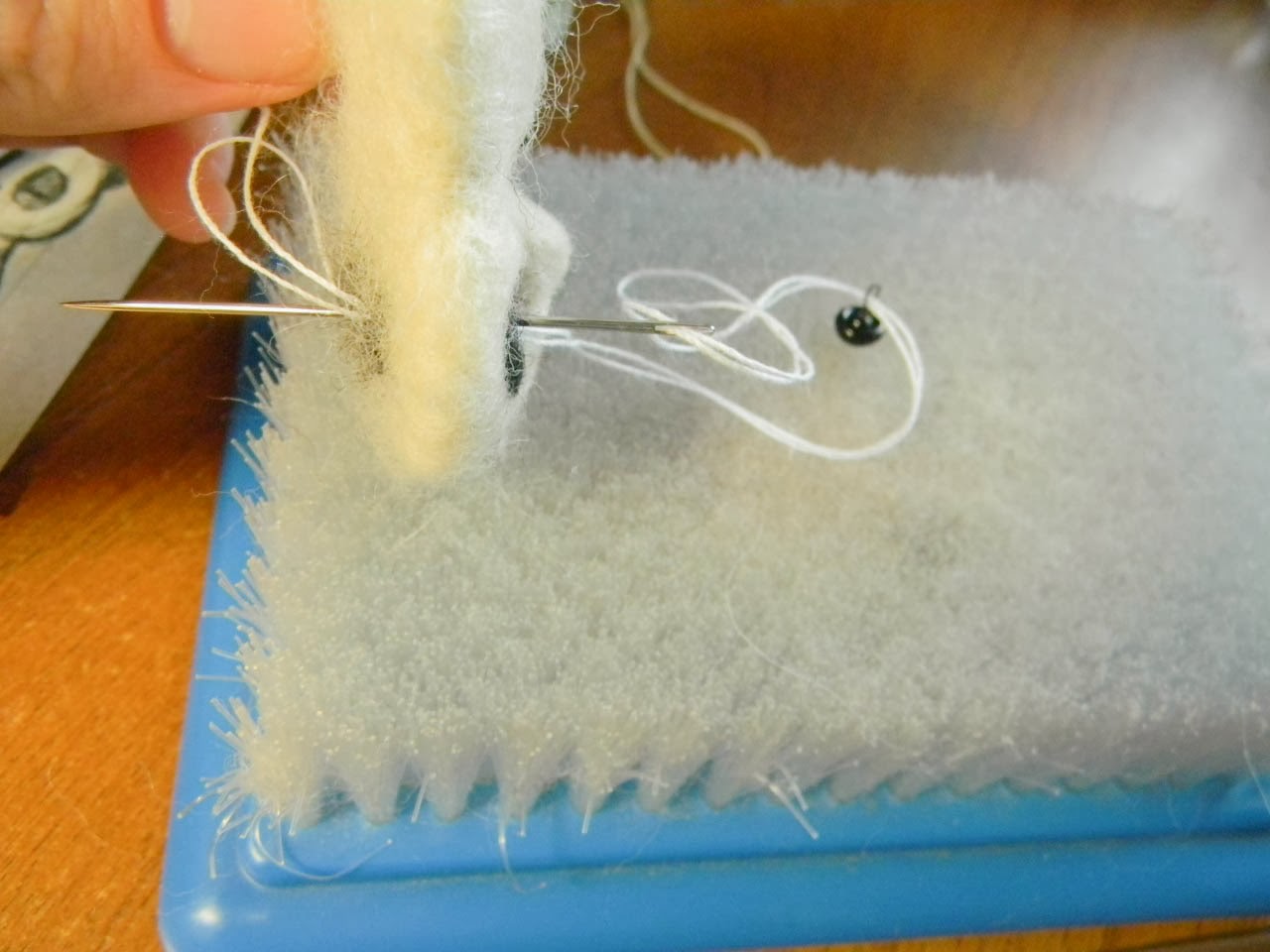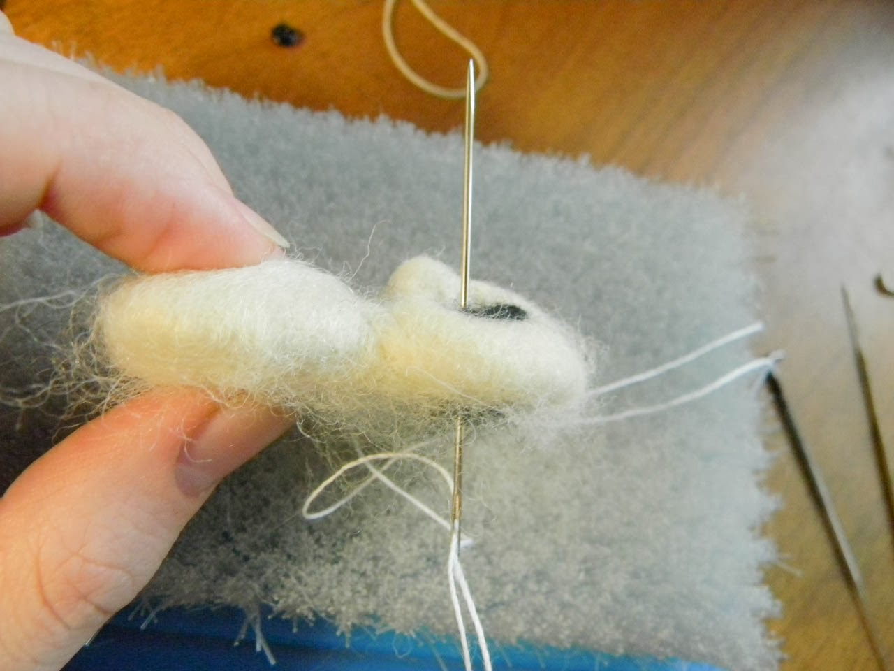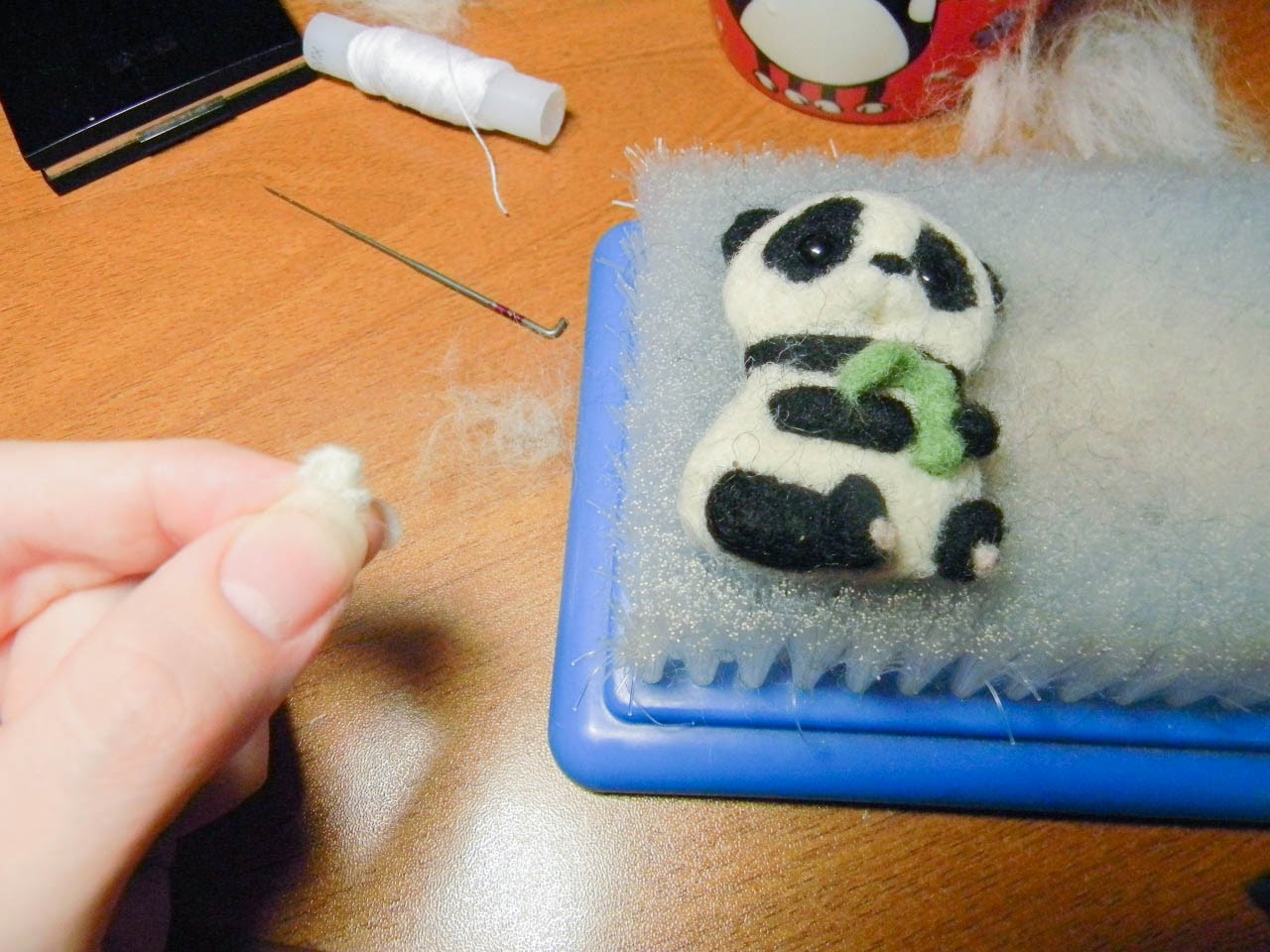 Чтобы сделать губу я сваляла по кромке небольшой кусочек белой шерсти (то, что держу в руках). В предполагаемом месте ротика я сделала дырочку шилом. Потом получившуюся дырочку прошла тоненькой иголочкой. В противном случае со временем волокна восстановят свою форму и ротик у панды закроется. По низу дырочки ротика и приваливаем губу.