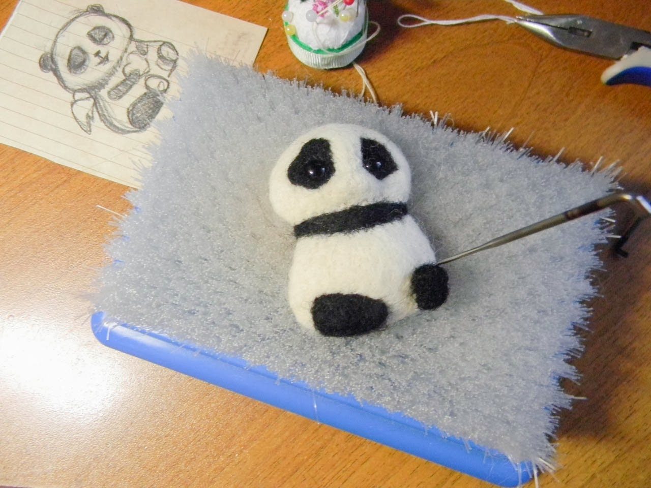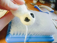 Тут у меня уже ушки на голове. Как я уже говорила, ушки я забыла включить в первоначальную основу, поэтому приваливала отдельно. Сначала я сделала сами ушки. Мохнатые кончики ушек я приваляла к обратной стороне мишки. Потом валяла в месте границы туловища и ушек, пытаясь завести волокна ушек в основную форму, а волокна формы - в ушки. Тут не вставляем иголку слишком глубоко, иначе наши черные волокна могу вылезти из мордахи панды =)