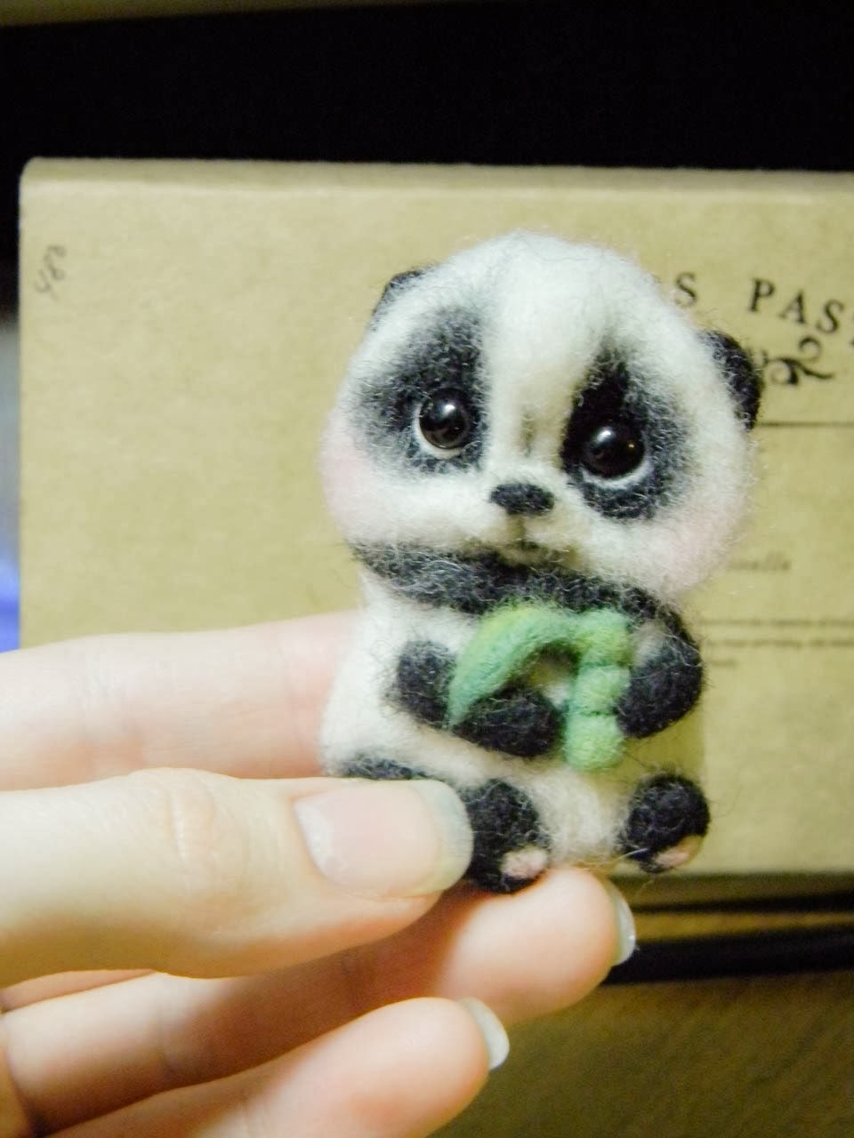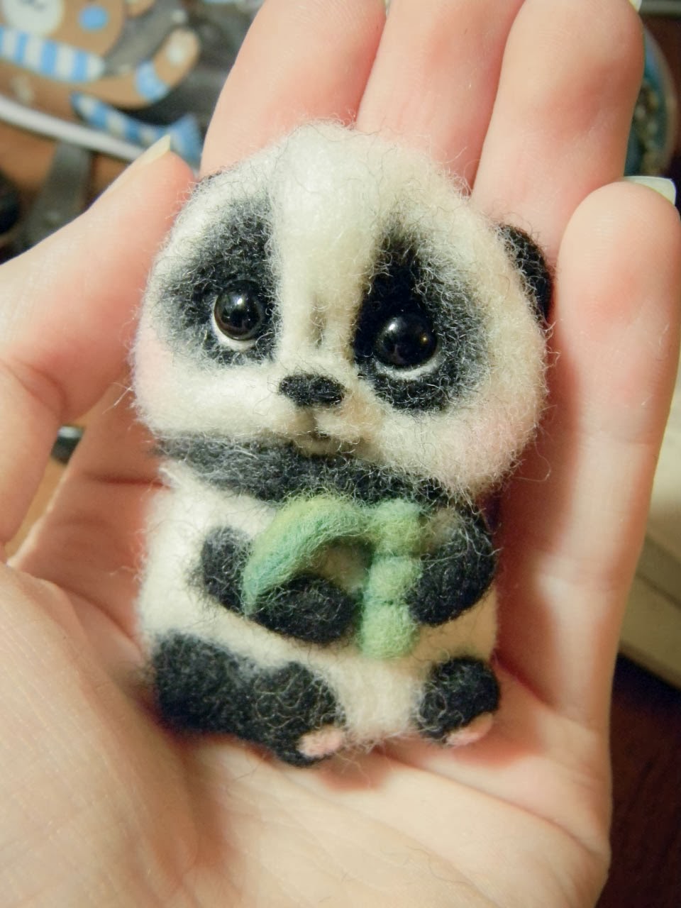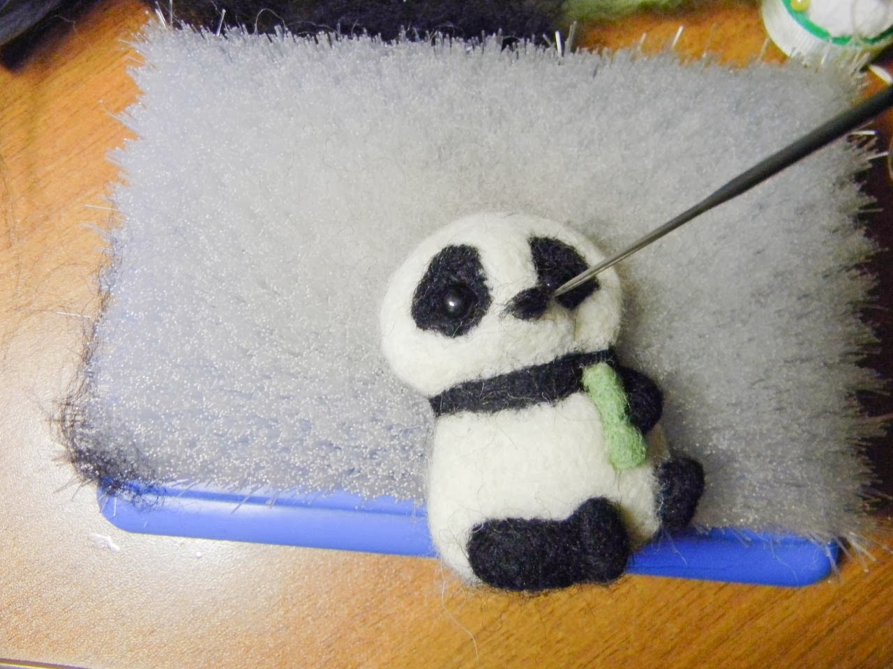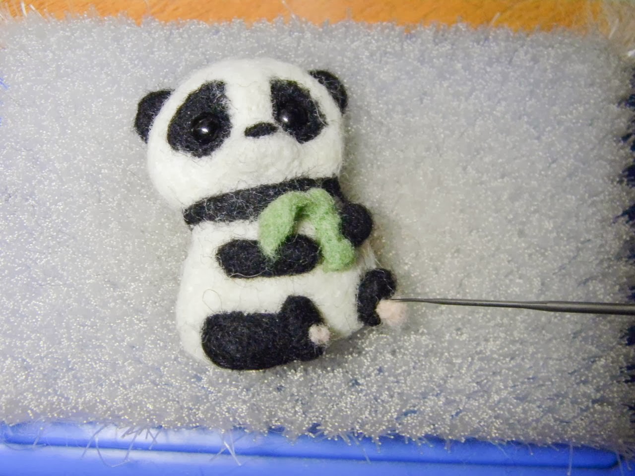Вы заметили, что у бамбука уже вырос листик? =) Для этого мы валяем сначала треугольник на мате, потом мохнатым кончиком приклаываем к стеблю и приваливаем к нему. Потом по грани касания листика и панды проваливаем, тем сама соединяя эти детали.