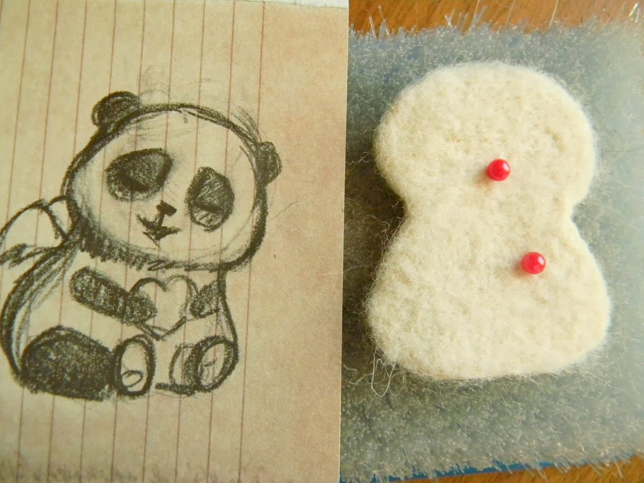 Вместо сердечка, который нарисовала на эскизе, я решила сделать бамбук. Сначала делаем такой маленький огурчик и потом его уже приваляем к туловищу. Если валять сразу на панде есть вероятность пролететь с размером или собрать нужную форму будет тяжело и будет казаться, что бамбук растет в самом мишке.