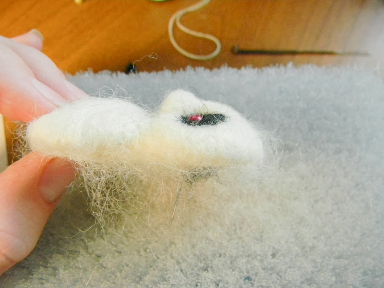 Делаем белок под нашим глазиком. Я использовала волокна вискозы. Можно взять волокна шелка или просто белую шерсть. В зависимости от того, где мы сделаем белок, мы сформируем взгляд нашего малыша. Я люблю когда они смотрят вверх =)