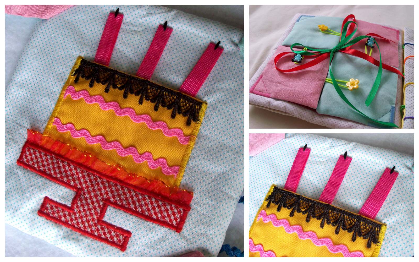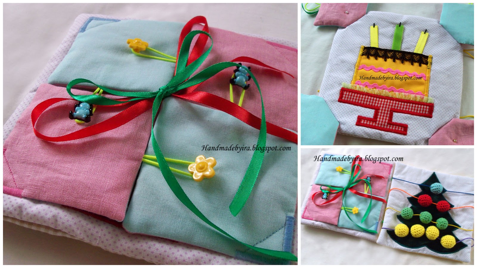 Десятая страничка - подарок-тортик. Чтобы к нему добраться нужно и ленточки развязать и пуговки расстегнуть. А в торт-кармашек можно положить печенюшку :)